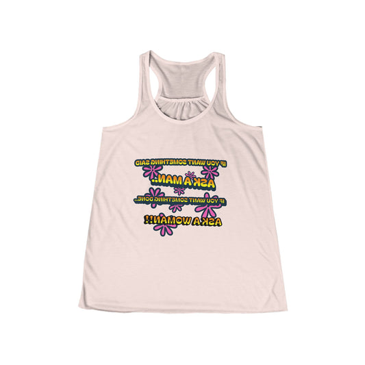 Empowering Women's Flowy Racerback Tank - 'Ask a Woman' Fitness Motivational Tee